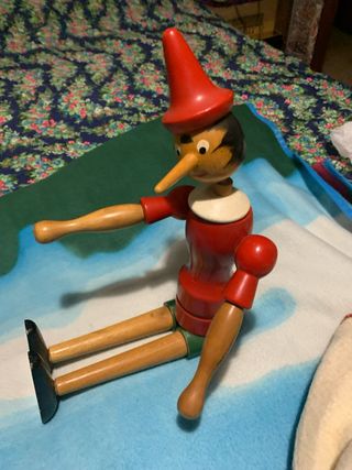 Pupazzo di Pinocchio in legno, un classico intramontabile. - Cappello rosso a punta. - Vestito rosso con colletto bianco. - Pantaloncini verdi. - Braccia e gambe snodabili.