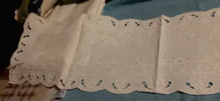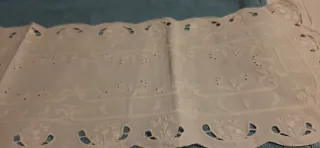 Bellissimo centro in tessuto finemente ricamato a mano con motivi floreali e intagli. - Ricco ricamo artigianale. - Motivi floreali. - Bordi intagliati. Misura 86x22 cm.