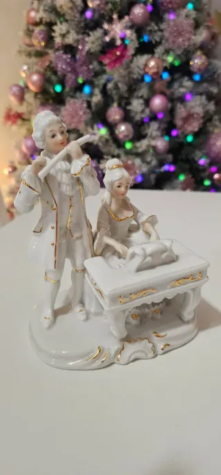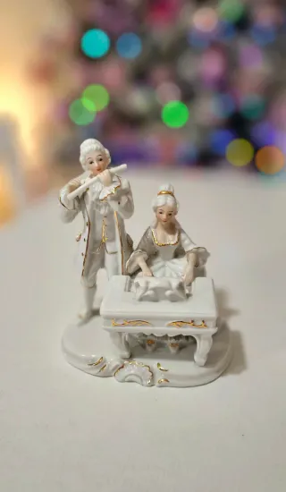 Raffinata coppia di musicisti in ceramica Capodimonte. Le figure sono finemente decorate con dettagli dorati. - Realizzati in ceramica di alta qualità. - Decorazioni in oro zecchino. - Design classico e raffinato.