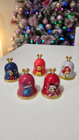 Set di 5 campanelle natalizie Disney. - Campanella con Minnie (introvabile) - Campanella con Winnie the Pooh - Campanella con Stitch - Campanella con Pluto - Campanella con Ariel Tutte in condizioni perfette, tenute in esposizione in vetrina.