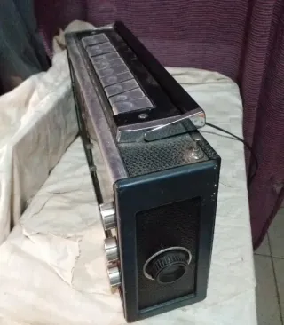 Radio portatile Grundig Satellit 2000, un classico per gli appassionati.funzionsnte - Design vintage con finiture argentate e nere. - Altoparlante frontale a griglia. - Manopole per la sintonia e il volume. - Indicatore di frequenza luminoso.