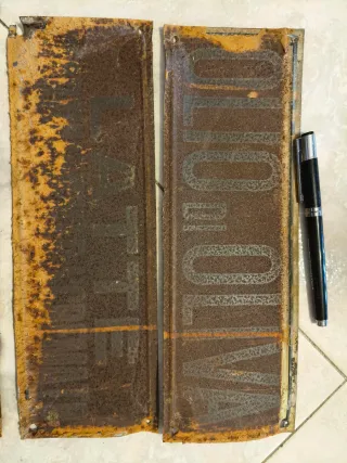 Tre vecchi cartelli in metallo, ideali per arredamento vintage o per un negozio. - Cartelli in metallo arrugginito. - Scritte prodotti slimentari