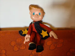 Pupazzo da collezione degli anni '70, un simpatico bambino con mantello.dietro ha il carillon a carica lunga che fa addormentare i bimbi.alto circa 50 cm. - Mantello nero con stelle gialle. - Vestiti rossi. - Dettagli in plastica.