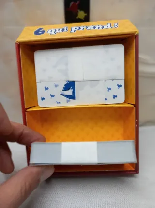 Carte da gioco per il divertente gioco 6 qui prend!. - Carte con disegno di piccole figure blu. - Scatola gialla con scritte rosse.