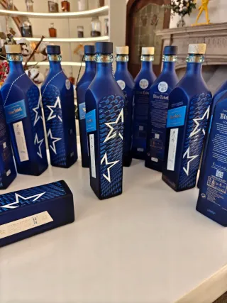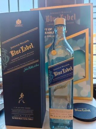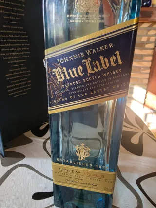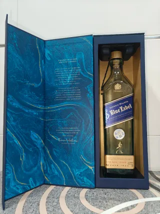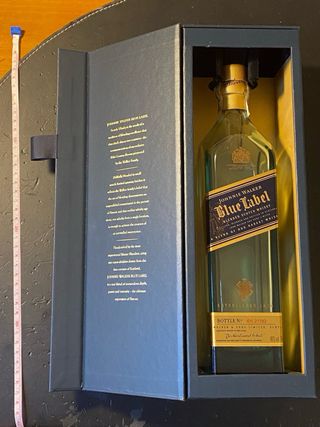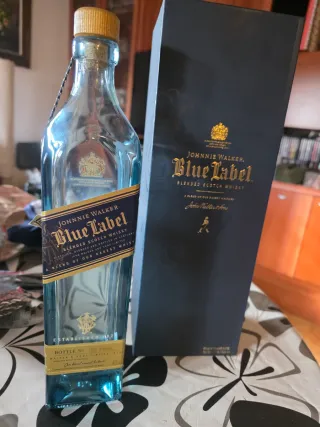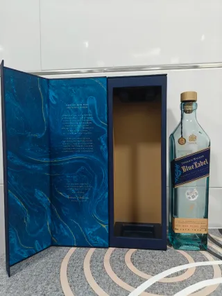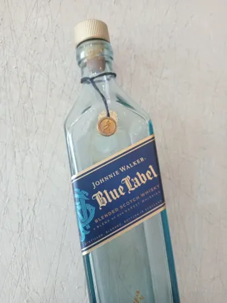 Bottiglia vuota di Johnnie Walker Blue Label. - Etichetta blu con dettagli dorati. - Non incisa. Incisone non disponibile. - Tappo originale. - Astuccio di lusso. - Design iconico del marchio.