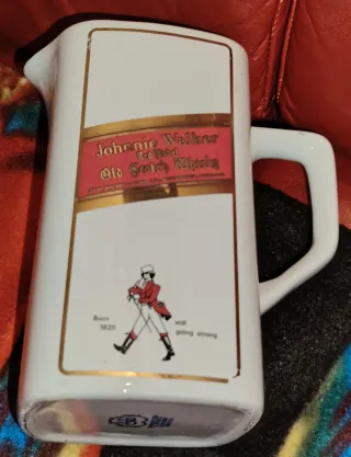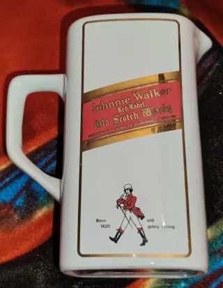 Brocca/Decanter in Ceramica, Pubblicitario Johnnie Walker Red Label,Originale Anni ’70, realizzato da Ceramica Piola – Carpignano Sesia (Italia).Oggetto da collezione raro, prodotto per pub e locali come materiale promozionale ufficiale. Caratteristiche:Marca:Johnnie Walker. Produttore: Ceramiche Piola (Made in Italy)Materiale :Ceramica.Colori:Bianco con dettagli rossi e oro.Periodo: Anni 1970.Condizioni: Ottime,Stampa nitida,ceramica lucida,manico perfetto.Ideale per collezionisti di whisky memorabilia,arredo bar o esposizione.Oggetto vintage Originale.