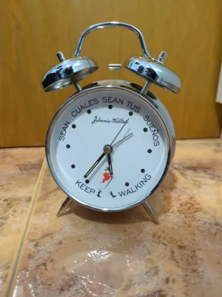 Sveglia vintage con il marchio Johnnie Walker. Design classico con campanelle. Quadrante con la frase Keep Walking e figura del camminatore. Iscrizione I tuoi sogni siano quali siano sul quadrante.