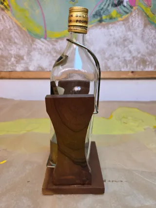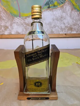 Bottiglia di whisky Johnnie Walker Black Label di 12 anni. Anno 1975 come si vede sul fondo del supporto. Vintage 100% Mede in England. Etichetta Black Label Old Scotch Whisky. Include versatore integrato nel tappo. Presentata in supporto di legno. Contiene un residuo di liquido alla base.