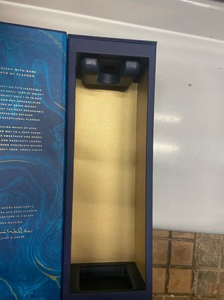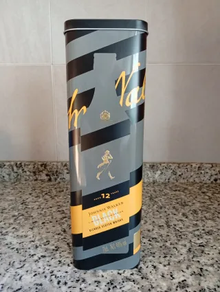 Scatola vuota di Johnnie Walker Blue Label da 1 litro. Ideale per collezionisti o come elemento decorativo. Design elegante in blu navy. Dettagli dorati. Include la figura del camminatore di Johnnie Walker.
