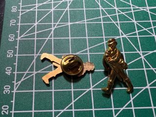 Due insegne dorate dell'iconico caminante di Johnnie Walker. Design dettagliato della figura. Finitura metallica brillante.