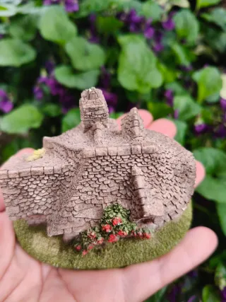 Presepe artigianale realizzato a mano, completo di ambientazione. - Scena della Natività con statuine. - Ambientazione rocciosa con vegetazione. - Cielo stellato con cometa. - Edificio a più livelli con dettagli. - Illuminazione interna.