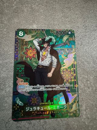 Carta del personaggio Dracule Mihawk dal gioco di carte collezionabili One Piece. - Personaggio: Dracule Mihawk - Numero carta: OP12-030 - Caratteristica: Blocker - Potenza: 8000