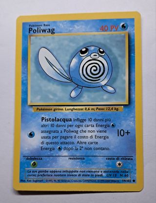 Card Pokèmon Set Base 1999-2000 Poliwag 59/102 Condizioni MINT (MN) La carta che riceverete è quella nella foto. Usato seconda mano Consegna a mano nelle vicinanze o spedizione. NB: Ogni spedizione viene fotografata per prova di qialsiasi tentativo di scambio di carte usurate o piegate. Le carte vengono spedite dentro toploder cartone e busta in pluribol.
