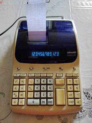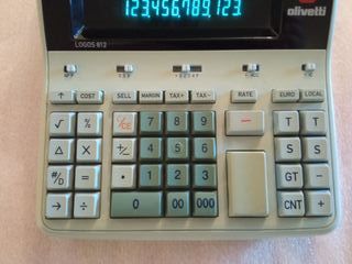 Calcolatrice da tavolo Olivetti Logos 812 con funzione di stampa. Calcolatrice Professionale da tavolo ben tenuta e poco usata, perfettamente funzionante. Da sostituire il nastro stampante perchè stampa sbiadito. Il tasto centrale si è consumato il simbolo “+”