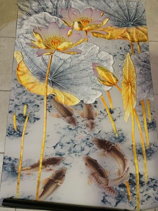 Bellissimo dipinto su tela raffigurante carpe Koi e fiori di loto. I colori sono delicati e i dettagli sono molto curati. - Dipinto su tela di alta qualità - Motivo: carpe Koi e fiori di loto - Stile: Giapponese - Colori: oro, grigio, rosa