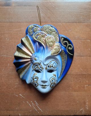 Set di due maschere veneziane decorate con colori vivaci e dettagli dorati. - Maschere in stile veneziano. - Dettagli glitterati dorati. - Motivi decorativi dipinti.