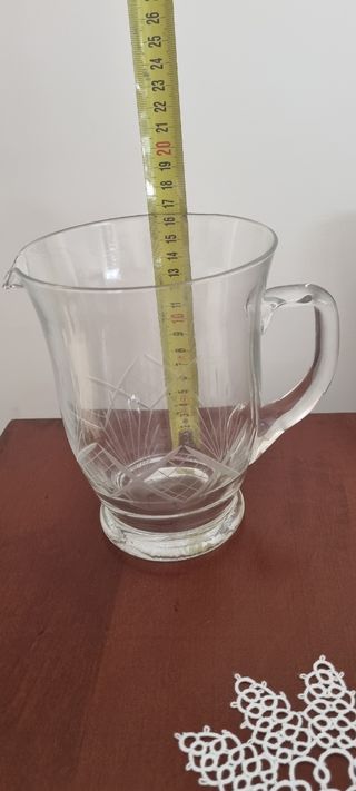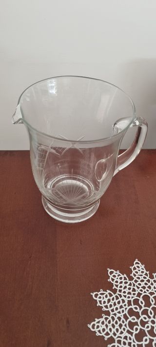 Elegante caraffa vintage in vetro trasparente, perfetta per servire bevande con stile. - Realizzata in vetro trasparente. - Presenta decori incisi a rilievo. - Manico e beccuccio per versare facilmente.