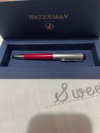 Penna Waterman in elegante confezione. - Corpo in metallo spazzolato. - Dettagli in colore bordeaux. - Clip in metallo. - Logo Waterman inciso sulla confezione.