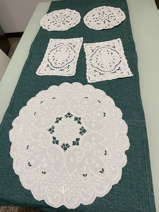 Set di centrini in pizzo bianco, perfetti per decorare la tua tavola o altri arredi. - Un centrino rotondo grande. - Due centrini quadrati. - Due centrini rotondi piccoli.