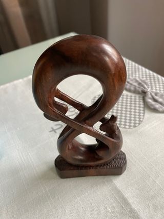 Elegante scultura in legno che rappresenta il simbolo dell'infinito con due figure intrecciate. - Materiale: Legno scuro. - Design astratto e moderno. - Base in legno per stabilità.