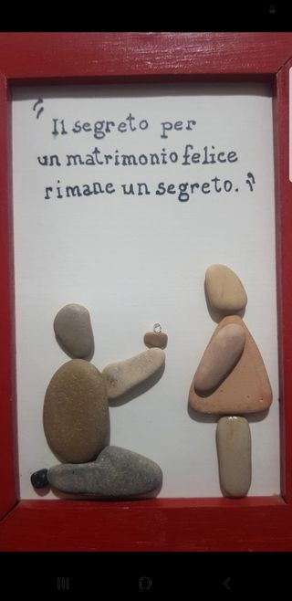 Delizioso quadretto decorativo realizzato a mano con sassi. Raffigura una coppia e una frase. - Il segreto per un matrimonio felice rimane un segreto. - Cornice rossa. - Pezzo unico. - cm 12 × 17 - la i della scritta ha una leggera sbafatura nella parte inferiore (come da foto)