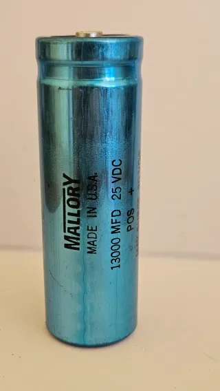 Condensatore elettrolitico Mallory (EIA code 235), Made in USA, capacità nominale 13.000 MFD (µF), 25 Volt DC. Codice impresso 235-7617A, che identifica la produzione settimana 17 del 1976. Componente originale d’epoca, tipologia computer grade, corpo in alluminio, ancora in ottime condizioni estetiche. Non è stato testato, venduto come oggetto vintage o da esposizione, non garantito funzionante. Ottimo per: collezionisti di componenti elettronici storici USA, restauratori di amplificatori o alimentatori d’epoca, esposizione in laboratori, vetrine o setup retro-tech. vista l’età (oltre 45 anni), non adatto all’uso elettrico.