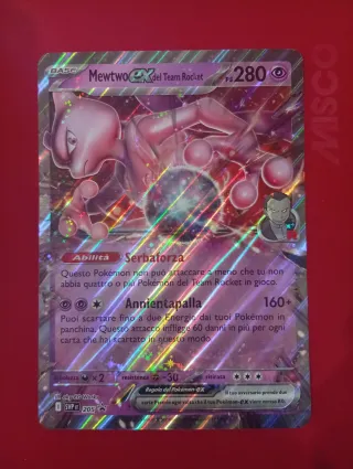 Carta Pokémon Mewtwo-EX del Team Rocket. - Abilità: Serbaforza - Attacco: Annientapalla - Debolezza x2 - Resistenza -30 - Ritirata - Regola del Pokémon-EX