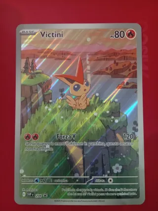 Carta Pokemon Victini V con l'attacco Forza V. - Attacco: Forza V - PS: 80 - Danno: 120 - Debolezza: x2 - Resistenza: Nessuna - Costo di ritirata: 1 - Illustratore: Amelicart - Numero carta: 208/208