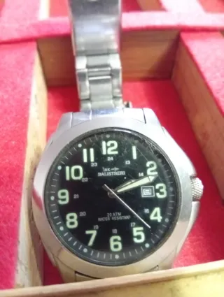 Orologio da polso Balestrieri con cassa in metallo e cinturino. - Resistente all'acqua fino a 20 ATM. - Quadrante nero con numeri luminosi. - Datario. - Movimento al quarzo.
