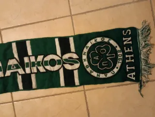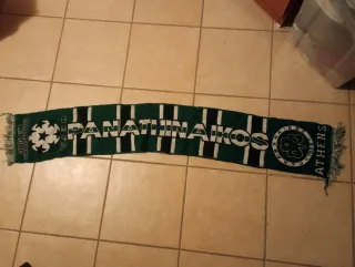 Sciarpa ufficiale del Panathinaikos FC, edizione UEFA Champions League 2004. - Colori: verde, bianco e nero. - Logo UEFA Champions League sul lato sinistro. - Scritta PANATHINAIKOS al centro. - Stemma del club con ATHENS 1908 sul lato destro.