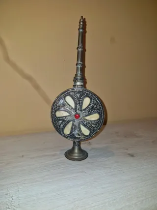 Antica bottiglia di profumo marocchina, in metallo, spesso usata come vaporizzatore di acqua di rose. Design: Il corpo centrale ha una forma circolare decorata con un motivo floreale a otto petali, con un centro rosso e petali avorio Materiali: Realizzato in metallo con finitura anticata, possibilmente ottone o una lega simile. e inserti in pietra. • Funzione: Utilizzato per contenere e spruzzare profumi o acqua di rose, come da tradizione marocchina. • Stile: Oggetto decorativo vintage che riflette 'artigianato tradizionale.