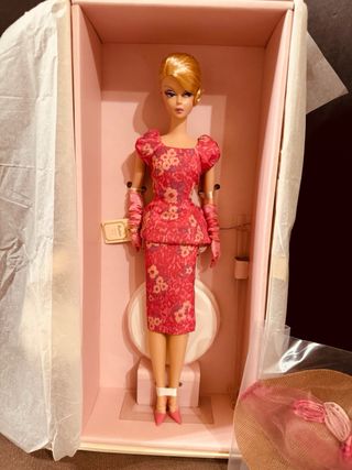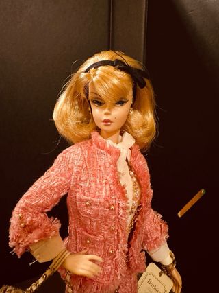 Bellissima Barbie Silkstone Preferably Pink, in ottime condizioni. completa di tutti i suoi gioielli, orecchini, collana, bracciale, cintura gioiello, borsa, particolare le scarpine con la punta nera, completa di piedistallo no scatola - Vestito rosa in tweed - Accessori inclusi - Perfetta per collezionisti