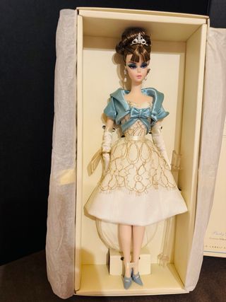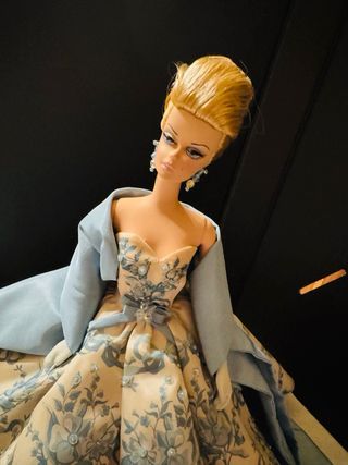 Bellissima bambola Barbie Silkstone The Soiree, in perfette condizioni. completa di tutti i suoi accessori, guanti scarpe, piedistallo come la vedete nella sua scatola - Vestito lungo color azzurro polvere con dettagli scintillanti. - Accessori inclusi: tiara e collana. - Splendida acconciatura raccolta.