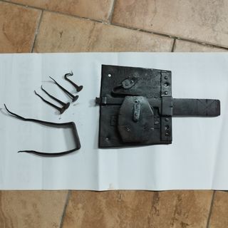 Vendo antica serratura in ferro. È completa di tutti i suoi pezzi. Presenta segni di usura e ruggine, coerenti con la sua età. Pezzo unico introvabile '800 Vintage per portoni Pezzo unico introvabile completa di Chiodi, e accessori periodo '800. Misure: piastra 17x21 cm Pulita e oliata - Serratura in ferro battuto - Colore bianco con parti arrugginite - Include 4 chiodi più passante x mandata