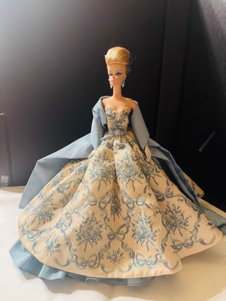 Bellissima Barbie Silkstone con abito da sera. - Vestito elegante in seta color crema con ricami dorati. - Bolero coordinato color azzurro cielo. - Scarpe azzurre eleganti. - In perfette condizioni, nella sua confezione originale.