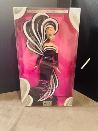 Bellissima bambola Barbie Spotlight del 1961 in porcellana. Indossa abito nero a sirena, guanti con foulard in una mano, gioielli inclusi completa di microfono edizione del 1989, numero di serie 17158 la numerazione la troviamo sulla scatola, sul certificato di garanzia e dietro il busto della Barbie in piccolo color oro, made Malaysia quindi ancora più rara, sotto l’abito indossa un body intimo molto elegante con calze autoreggenti e reggicalze, include anche le scarpette piedistallo, scatola e certificato tutto quello che vedete in foto, vendo con formula visto e piaciuto