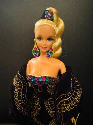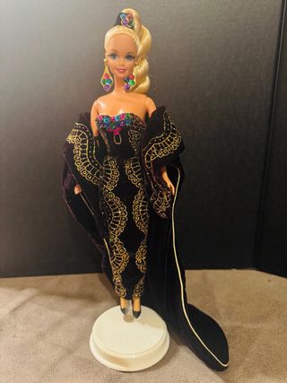 Bellissima Barbie Happy Holiday del 1998, in ottime condizioni. La parte di dietro sono presenti ancora i ganci in metallo dove la bambola era allegata alla scatola, la Barbie è fornita come la vedete in foto senza scatola, incluso un piedistallo in plexiglas trasparente di altissima qualità - Vestito lungo nero con dettagli scintillanti. - Mantello rosa acceso. - Accessori inclusi: tiara e orecchini, scarpe