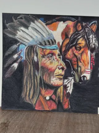 Un suggestivo ritratto a pastello di un nativo americano con il suo cavallo. L'opera è arricchita dalla presenza di un acchiappasogni. - Tecnica mista su cartoncino 23*17 cm - Raffigurazione di un uomo nativo americano con copricapo piumato. - Cavallo dal manto pezzato. - Dettaglio dell'acchiappasogni.