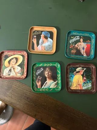 Set di 5 sottobicchieri in metallo con immagini vintage Coca-Cola. - Design retrò con diverse illustrazioni. - Materiale: metallo. - Ideali per collezionisti o per un tocco vintage.