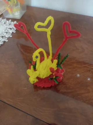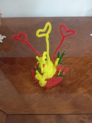 Deliziosa bomboniera creata a mano, perfetta per ogni occasione speciale. - Realizzata con fil di ferro e nastri colorati. - Decorata con cuori rossi e gialli e un fiorellino centrale. - Base rossa e verde che ricorda un nido.