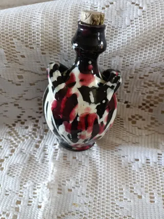 Bottiglia votiva in creta, decorata con scritte. - Materiale: creta. - Colore: nero con decorazioni bianche. - Scritta: S. Lucia.