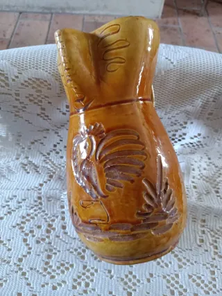 Bellissimo boccale in creta decorato con un gallo. Cm20 - Decorazione a rilievo con gallo e motivi vegetali. - Finitura lucida color miele.