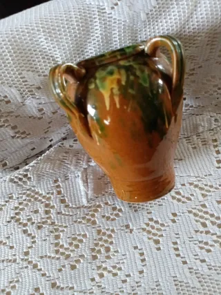 Piccola capasa o vaso salentino, realizzato in terracotta con finitura smaltata. Cm13 - Colore principale: terracotta. - Dettagli in verde. - Due manici laterali.