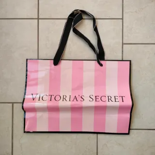 Borsa in carta con il classico motivo a righe rosa e bianche di Victoria's Secret. Le maniglie sono nere con un sottile bordo bianco. Misure 41x31x15 cm