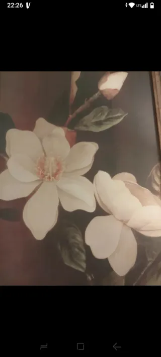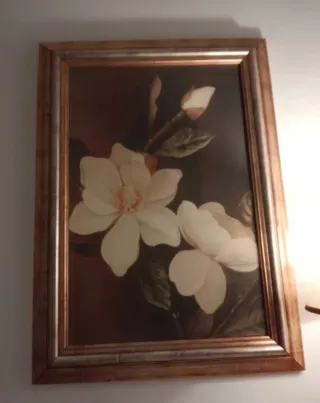 Grande stampa floreale su pannello di legno, con una cornice in legnodorato effetto anticato. Misura grande - Motivo floreale con magnolia. - Cornice in legno con finitura anticata.