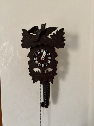 Orologio a cucù in legno scuro, tipico della Foresta Nera. Meccanico - Decorazioni intagliate con foglie e uccellino. - Quadrante con numeri romani. - Pendolo a forma di pigna.