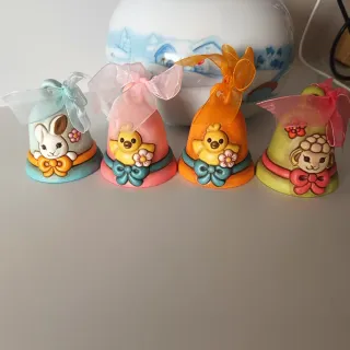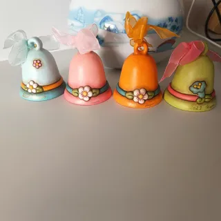 Set di 4 campanelle pasquali Thun, perfette per decorare la tua casa durante la Pasqua. - Campanella con coniglietto azzurro - Campanella con pulcino rosa - Campanella con pulcino arancione - Campanella con agnellino verde