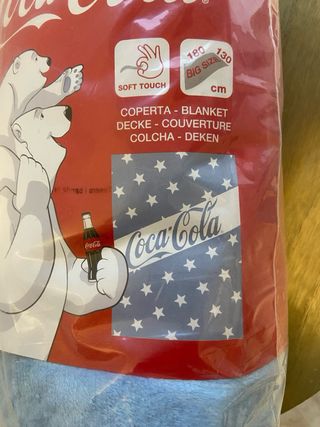 Morbida coperta plaid con il classico logo Coca-Cola e un design azzurro a stelle. Perfetta per aggiungere un tocco di stile e calore. Tessuto ultramorbido e caldo, 100% poliestere Lavabile in lavatrice. Anti Pilling: limita la formazione di pelucchi. Nuovo in busta originale mai aperta. - Dimensioni: 130 cm x 180 cm - Design con Logo Coca-Cola ben visibile e stelline.