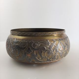 Ciotola, porta oggetti in ottone con inserti in rame impreziosito da una fine cesellatura Il lavoro di cesellatura appare molto accurato, con dettagli minuti che denotano un livello artigianale di pregio e stile medio-orientale. L’uso combinato di metalli conferisce un bellissimo contrasto cromatico. Dimensioni : diametro superiore cm. 17.5 diametro alla base cm. 21 altezza cm.10 Peso gr. 700 circa C00002069-4324 soprammobile, vaso, suppellettile
