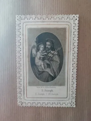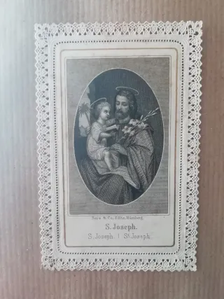 Antica stampa incisione religiosa merletto 1800 raffigurante San Giuseppe con il Bambino Gesù, incorniciata da un delicato bordo in pizzo Editore Serz Norimberga Condizioni ottime senza rotture Dimensioni cm 10,5x6,5 - Stampa antica - Incisione religiosa - Bordo in pizzo lavorato Antichità, litografia, Estampa antigua, religione, devozione, arte, dipinto, collezione, San Giuseppe, Santino, dentelle, Santino pizzo, estampa calada